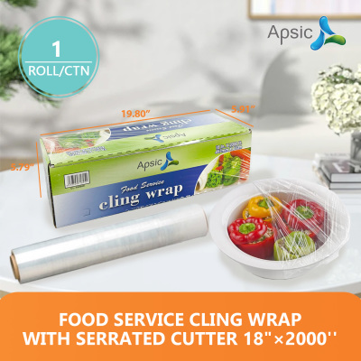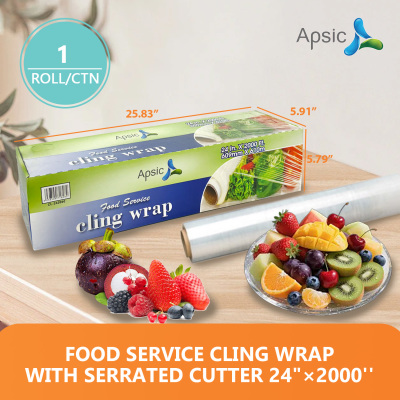 About this item Different Size: APSIC Food Service Cling Wrap have different size,12"×2000'/18"×2000'/24"×2000', professional foodservice plastic wrap for gourmet chefs in hotel, kitchen, restaurant and commercial Multipurpose Use: Keeps food fresher longer, freezer safe, can be used to wrap meat, fruits, vegetables Keep Foods Fresh: The Plastic Food Wrap made from extra-strong plastic wrap to seal in freshness, to keep foods fresh for a longer time Tears Off Easy: The Cling Wrap With Serrated Cutter can be torn away from the dispenser with ease Saving You Time: The plastic wrap with serrated cutter, allows you to easily use and cut as much wrap as you need, saving you time and effort Quantity